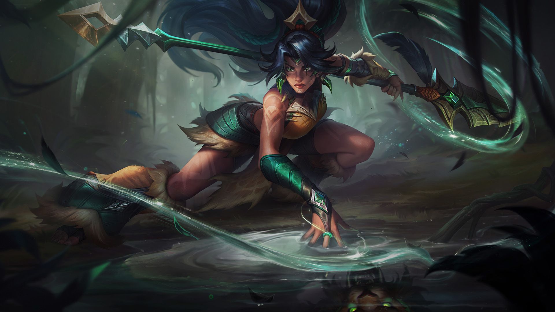 Raised in the deepest wilderness, Nidalee is a master tracker who can shapeshift into a ferocious pakaa jungle cat at will. Neither wholly woman nor beast, she viciously defends her territory from any and all trespassers, with carefully placed traps and deft spear throws. She cripples her quarry before pouncing on them in feline form—the lucky few who survive tell tales of a wild woman with razor-sharp instincts, and even sharper claws...